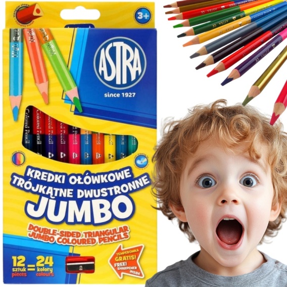 Z kredkami ołówkowymi Jumbo Astra Twoje dziecko zyska aż 24 różnorodne kolory, w tym także złoty i srebrny, które dodadzą blasku każdej pracy plastycznej.
